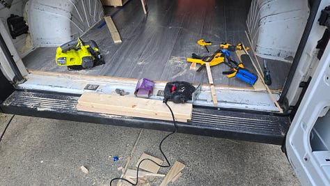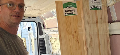 In my daydreams of this winter, this was going to go differently. I would slowly accumulate super cool authentic woods from diverse craft fairs, kindly old farmers, buildings that were in the midst of being demolished that I just happened to be driving past, and maybe just lying along the side of the road. Then I would assemble these ultra-unique and lived-in woods into a piece of art that would drive even the most stoic of weightlifters to their knees, weeping and asking me to tell the tale of every last piece of my otherworldly van build.