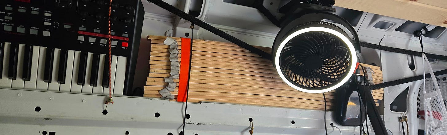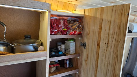 Not everything is in its right place yet. I still move things around a little; I need to add another magnet to the pantry door because EVERY ONCE IN A WHILE it will swing open. But nothing falls out! The only chaos is what I create myself… And I can live with that. I built a little shelf above my bed that is both soft reveal lighting and a little shelf I can put my keys and phone and such when it’s time to sleep. I got a little plate and magnets where I can stow my remotes (about half my day every day was finding those damn remotes). But I have a spot for my kettle; a place where my cast iron fits perfectly. My water jug is securely trapped in a prison of wood; no more artificial lakes in the van please! My clothes all fit above the headboard and if they start to not fit, I’ll throw some shit away. I built in and carpeted the headboards of the bed so I have room to stretch. My power station is up off the floor (and out of danger of floods) and most of the wiring is hidden and hooked up properly. I have a little power strip with switches for each thing, so I can lay in bed and turn off the internet up front so it doesn’t eat up my battery while I sleep.