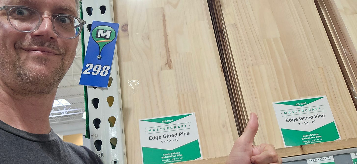 Edge glued pine shelving! It is so cheap! It is so beautiful! I was a total asshole and took down the entire stack, sorted through it all, and found the five prettiest boards. I had my wood. I got a big piece of HardiBoard for filling in blanks, got some screws and glue and everything I thought I would need and loaded up the van. It was time to get to work.