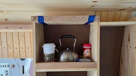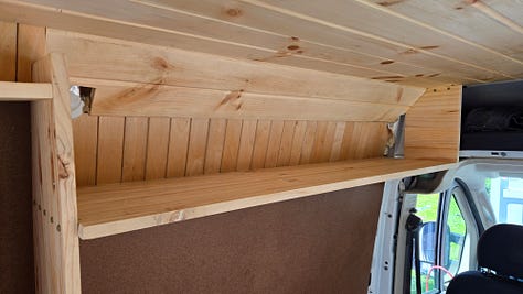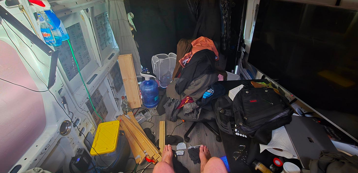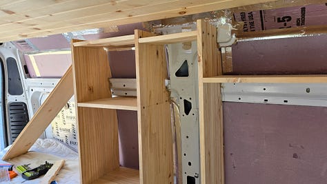 So, I used to know how to build stuff. Me and my dad built an entire house by ourselves when I was fourteen. I used to be a drywall hanger. But man, it had been a long time. And building more or less straight shelves into the walls of a very twisty and curvy and off-angle van was going to be… A challenge. But I set to work; I would just figure it out. And if something wasn’t quite right, if I drilled a hole in the wrong piece or a joint didn’t fit or something just looked bad, well?