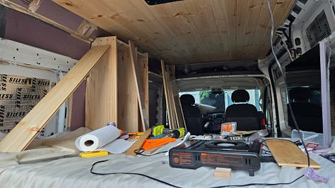 So here were the goals for the project: I wanted to turn my van into somewhere that I would enjoy writing inside for about two hundred bucks. It was an arbitrary number, but seemed appropriate and I needed a limit; I work in construction estimating and I know all about how fast construction projects can balloon their budget. It would be very on-brand for me to finish the project with a finely machined mahogany interior, polished brass fittings, and no money left for gas. So I had my budget, I had a ghost of a plan, and it was time to get some wood.